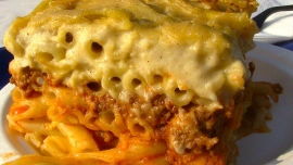 This is a very delicious meal, but messy to cook yourself, you will have a lot of washing up to do afterward. Pastitsio is baked in a dish in the oven and consists of three main layers: pasta, minced meat (usually beef or lamb) and a bechamel sauce topping.