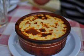 While there are different variations of this dish all over the Mediterranean region, the Greek version has proven rather popular. It is baked in the oven and the recipe can always be easily adjusted to a different number of guests. The ingredients are egg plant, mince (usually beef), pureed tomatoes, spices, some slices of potato, onion and garlic. This is then topped with a white bechamel sauce and a generous amount of cheese.